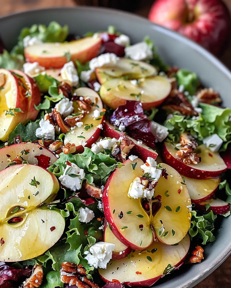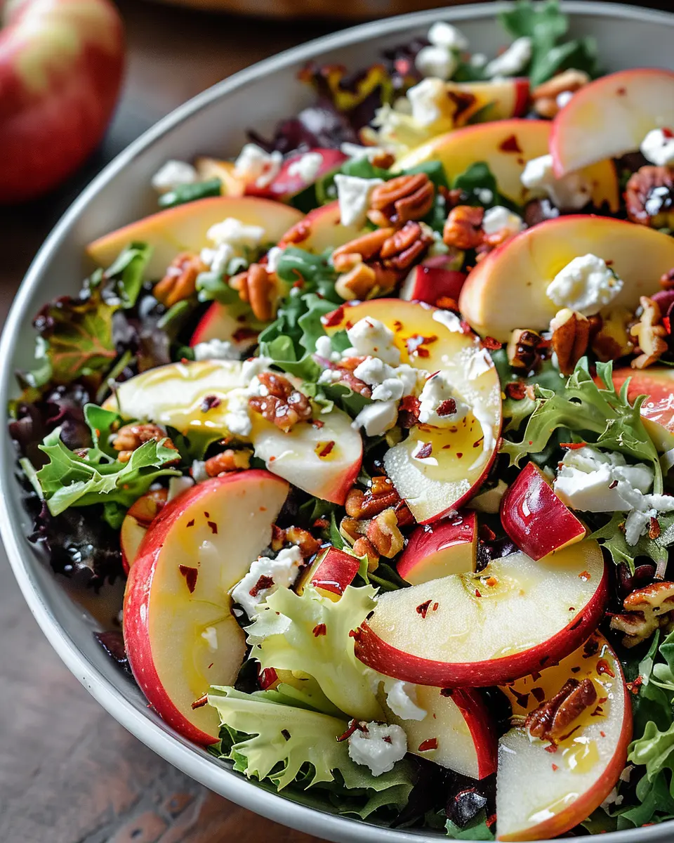 - In a large bowl, combine mixed greens, sliced apples, crumbled feta, walnuts, and red onion.