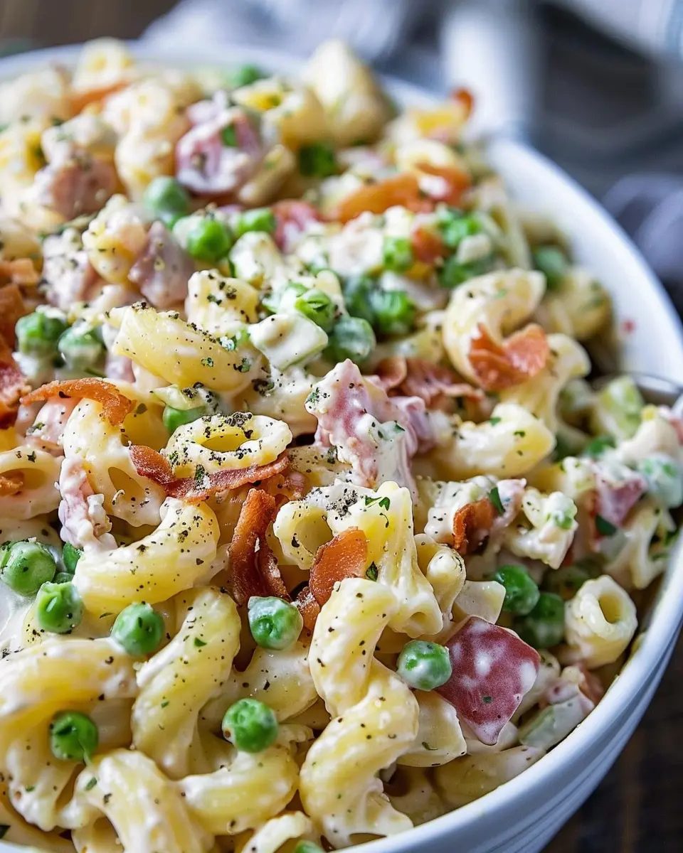 A delicious and creamy pasta salad packed with flavors from turkey bacon and chicken ham, perfect for family gatherings or picnics.