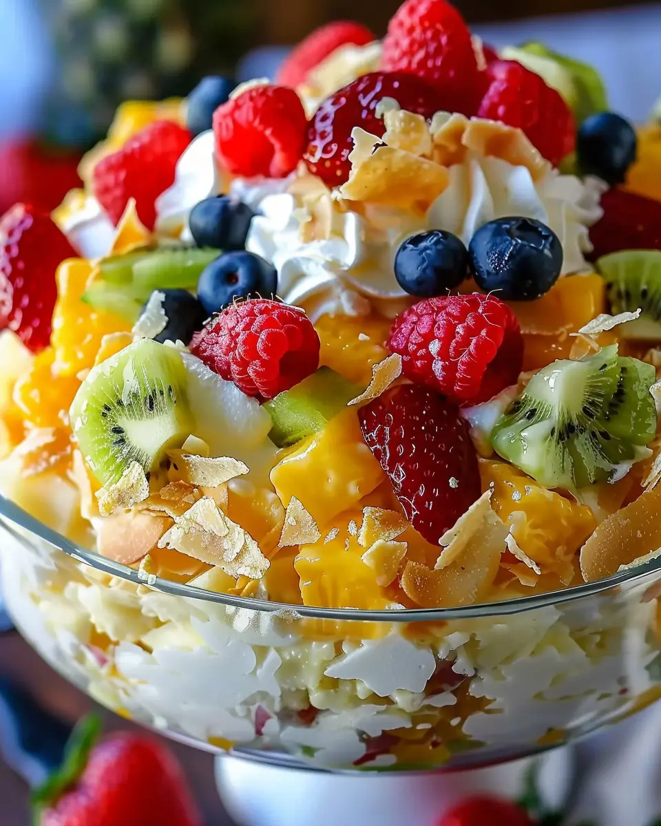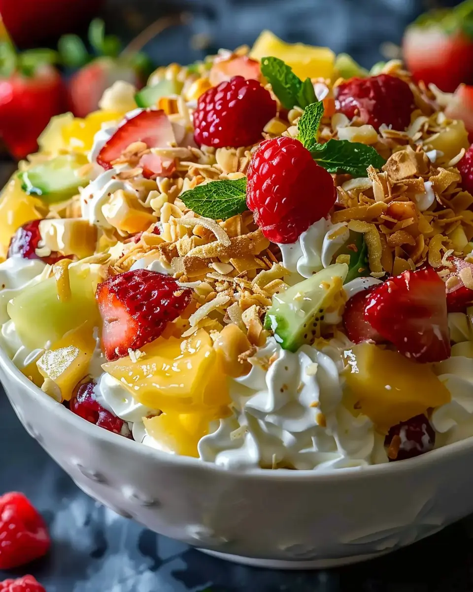 At this point, it’s time to bring all these delightful ingredients together! In a large mixing bowl, combine the cream cheese mixture, crushed pineapple, shredded coconut, mini marshmallows, and the diced fresh fruits. If you’re using nuts, this is the perfect moment to add those in too. Gently stir until everything is perfectly blended, making sure not to over-mix, as you want to retain that fluffy texture.