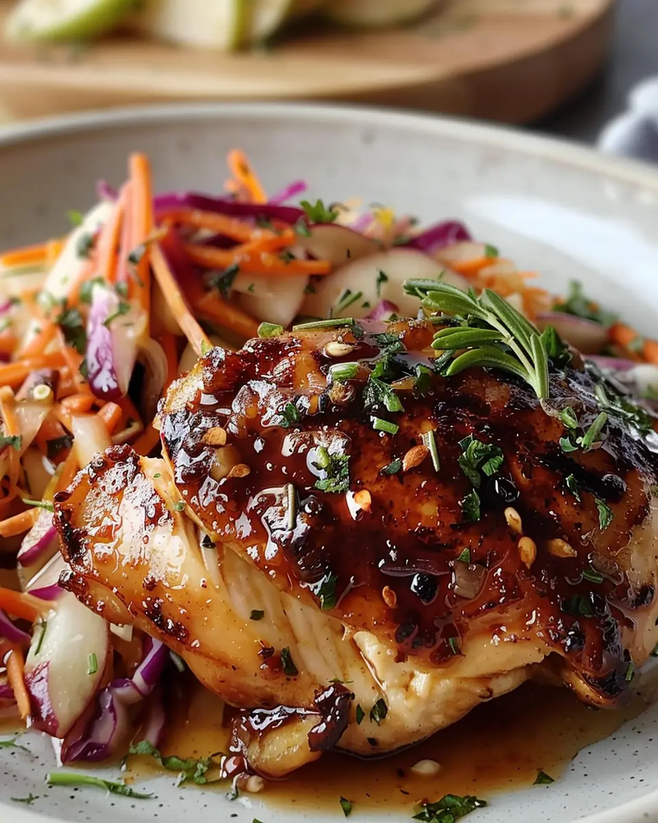 A delicious fall recipe featuring tender chicken glazed in sticky apple cider paired with a refreshing autumn slaw.